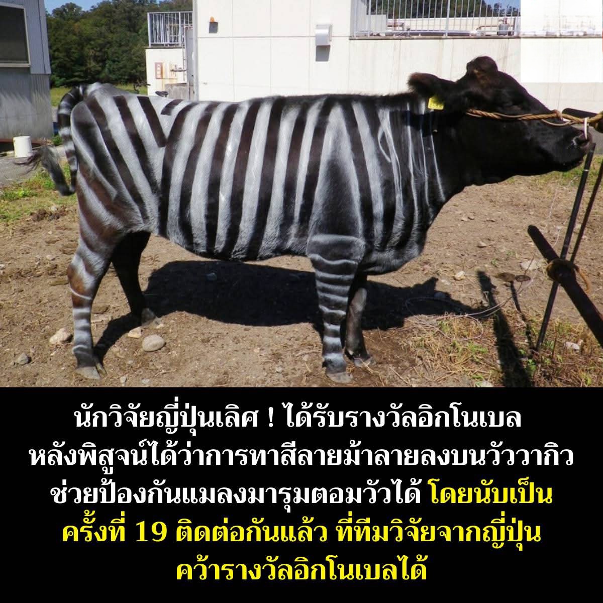 ทีมวิจัยนี้ค้นพบว่า หากทาสีลำตัววัวพันธุ์วากิวดำ (Kuroge Wagyu) ให้เป็นลายทางเหมือนม้าลาย จะช่วยลดจำนวนแมลงดูดเลือด เช่น แมลงวันคอกสัตว์ (ซาชิบะเอะ) ที่มาเกาะได้ ทำให้มีโอกาสนำไปใช้เป็นวิธีป้องกันศัตรูพืชโดยไม่ต้องพึ่งพาสารกำจัดแมลงได้ในอนาคต การคว้ารางวัลครั้งนี้ถือเป็นความสำเร็จของทีมนักวิจัยญี่ปุ่นที่ได้รับรางวัลอิก-โนเบลนี้ติดต่อกันเป็นปีที่ 19 แล้ว